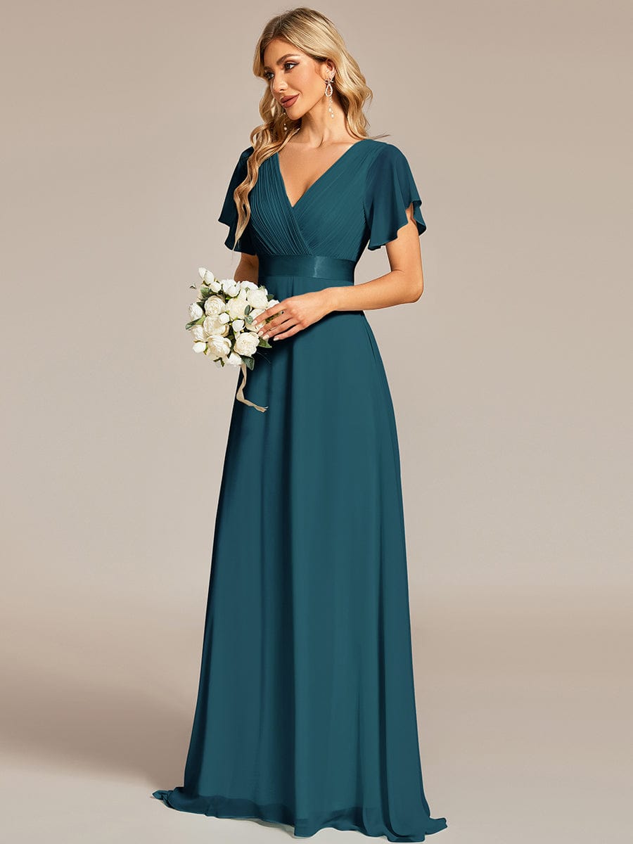 V-Neck Flutter Sleeve Floor-Length A-Line Chiffon Evening Dress