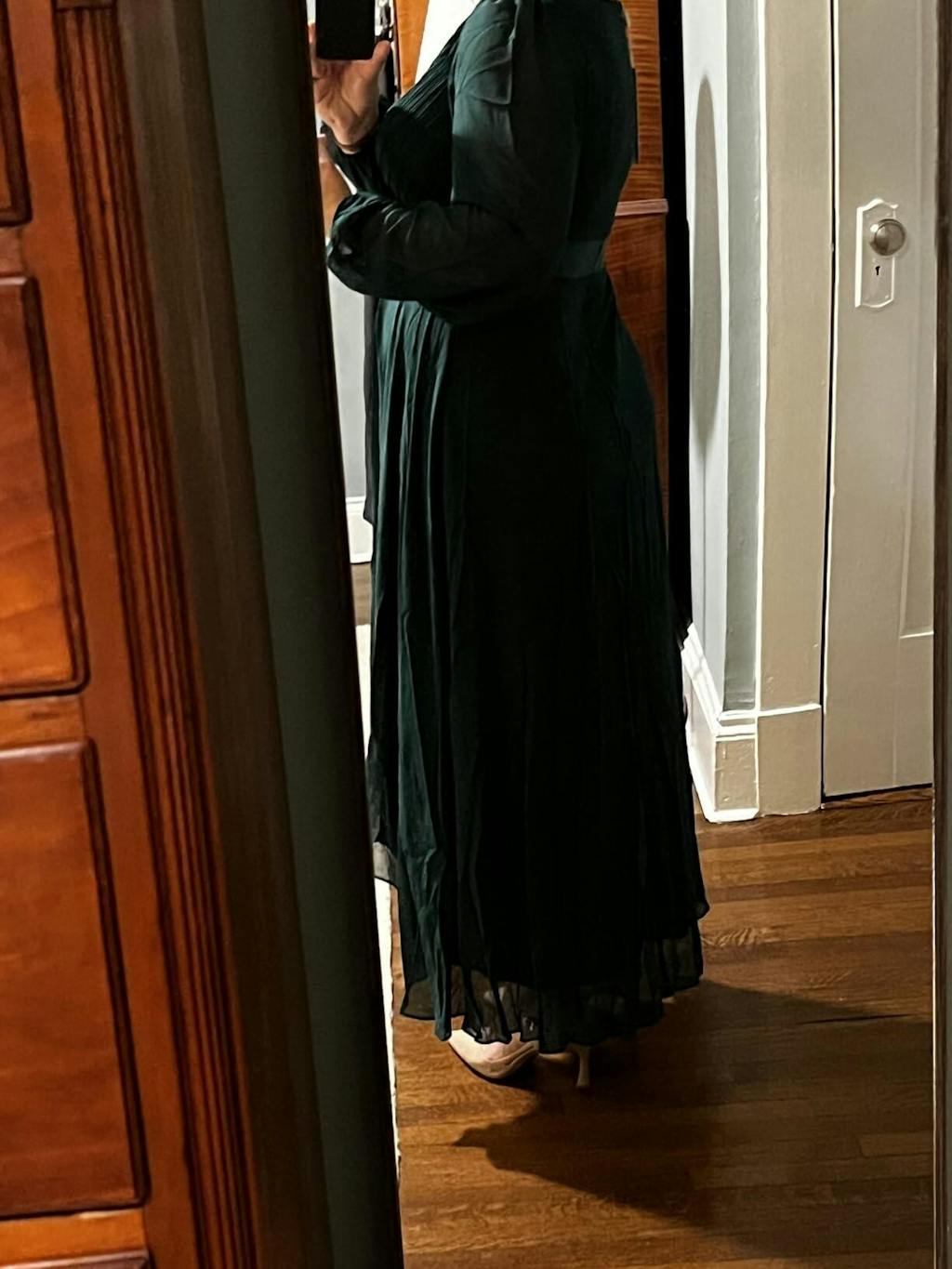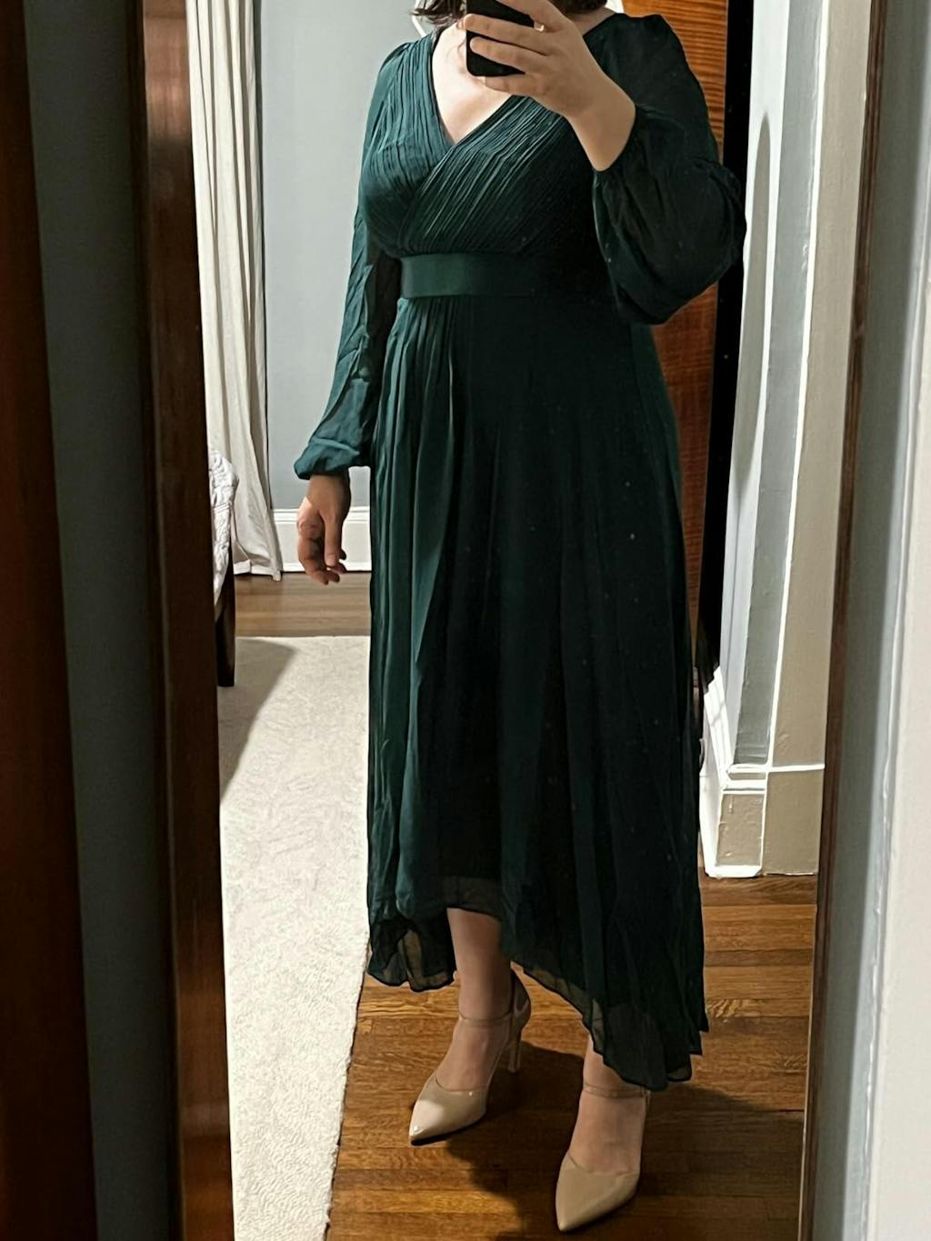 Experience the perfect blend of style and comfort with this empire waist midi dress. The soft chiffon fabric drapes beautifully, while the long sleeves and pleated detailing ensure a refined and graceful appearance.
