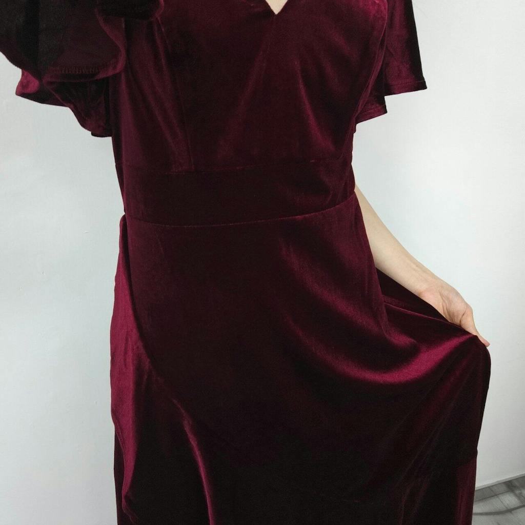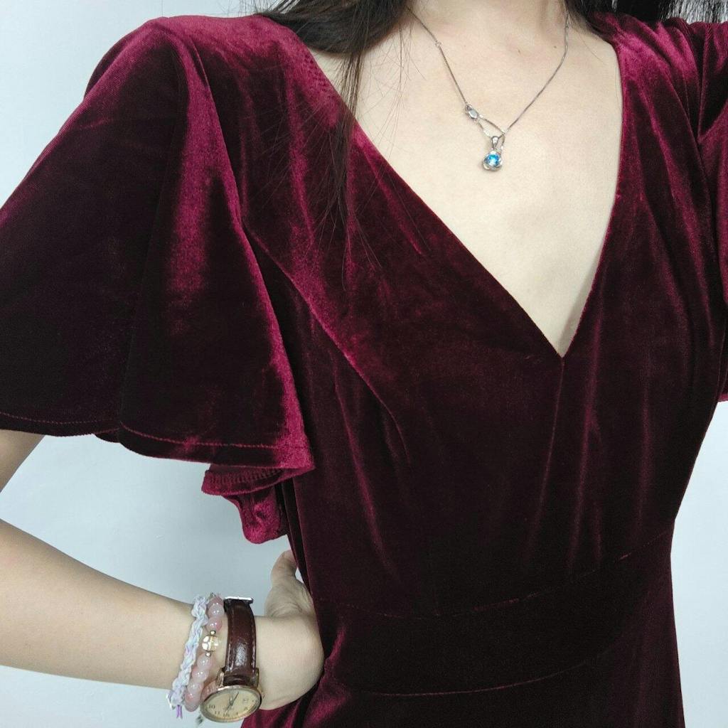Make a stunning statement in this elegant velvet bridesmaid dress, designed to bring timeless charm to any wedding celebration. Featuring a flattering double V-neckline that highlights the décolletage and short sleeves for a chic, comfortable fit, this dress blends sophistication with ease. The luxurious velvet fabric adds richness and depth, while the lotus leaf hem introduces a whimsical touch that flows gracefully with every step. Perfect for winter weddings or formal ceremonies, this dress ensures your bridal party stands out with effortless elegance.