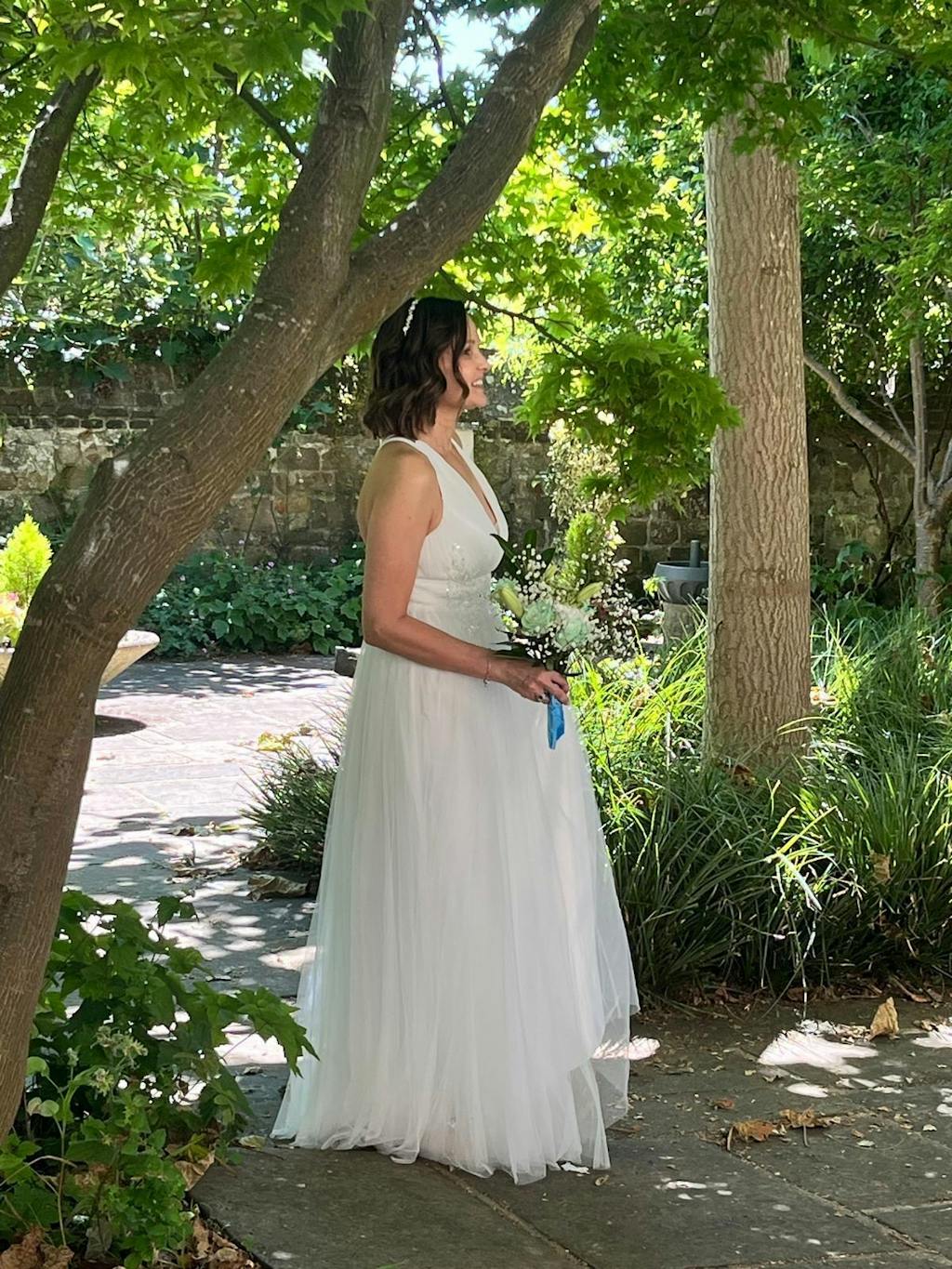 Experience timeless beauty in our Elegant V-Neck Sleeveless Pleated A-Line Wedding Dress. The V-neck and sleeveless design create a graceful and classic look, while the A-line silhouette and empire waist provide a flattering fit for all body types. The intricate pleated detailing adds texture and dimension to the dress, enhancing its charm. Crafted from delicate tulle, this gown exudes romance and sophistication. Walk down the aisle with confidence and grace in this enchanting wedding dress, perfect for a truly memorable celebration.