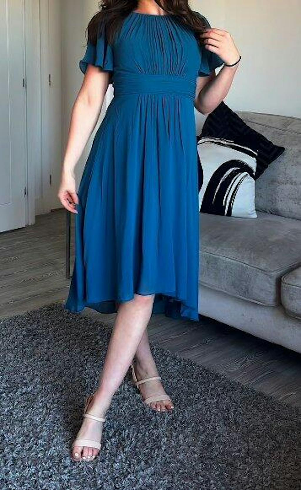 Elegance meets charm in our Flowy Chiffon Round Neckline A-Line Knee-Length Wedding Guest Dress. Crafted with care, this dress boasts a timeless A-line silhouette and a graceful round neckline. The flowy chiffon fabric adds a touch of ethereal beauty, making it the perfect choice for wedding guests. Dance the night away in this knee-length masterpiece that effortlessly combines comfort and style.
