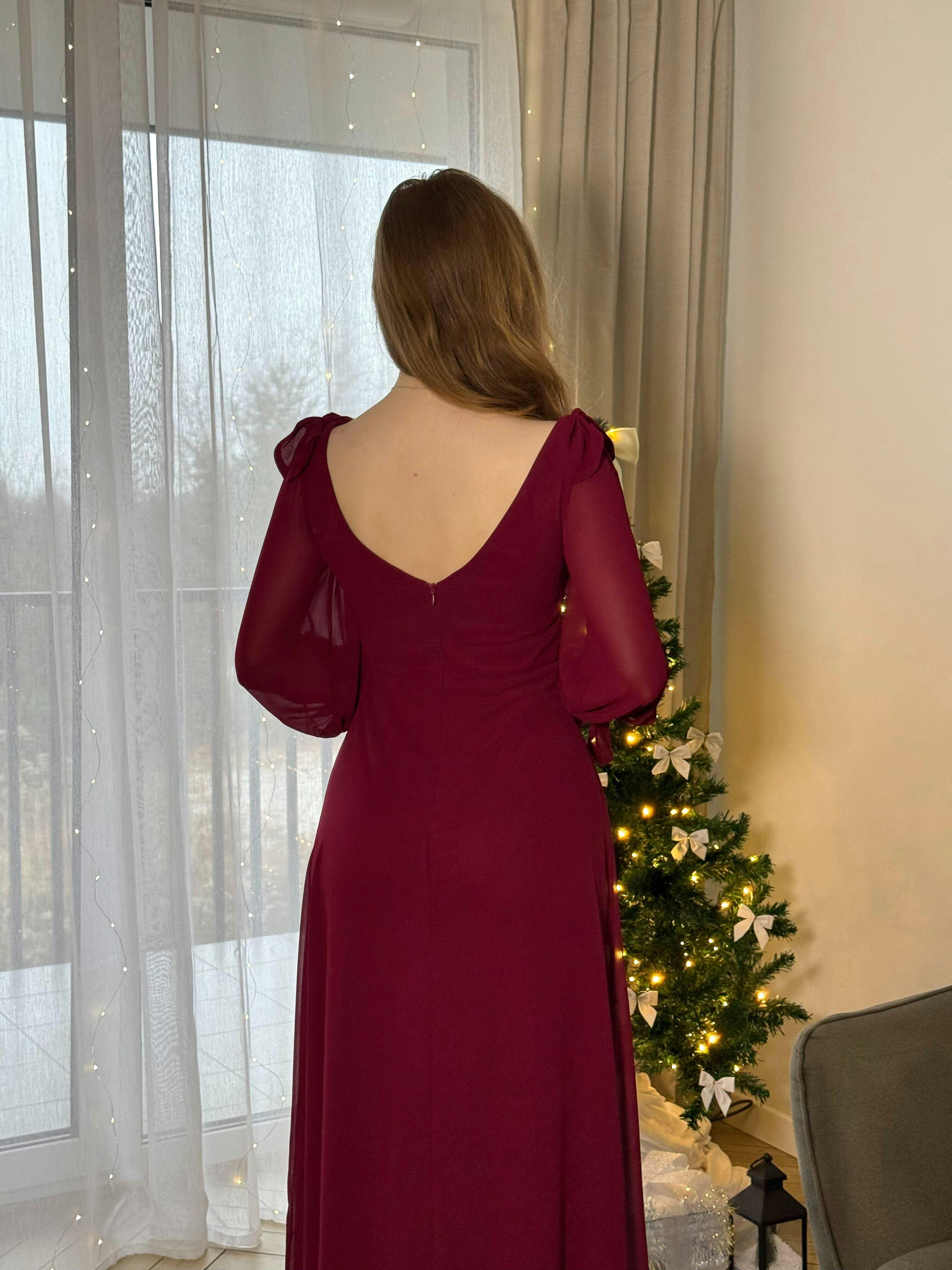 This minimal yet elegant bridesmaid dress is accented with split long sleeves, a V neckline, bow details on the shoulders and cuffs. It's followed by a long skirt with a thigh high slit.