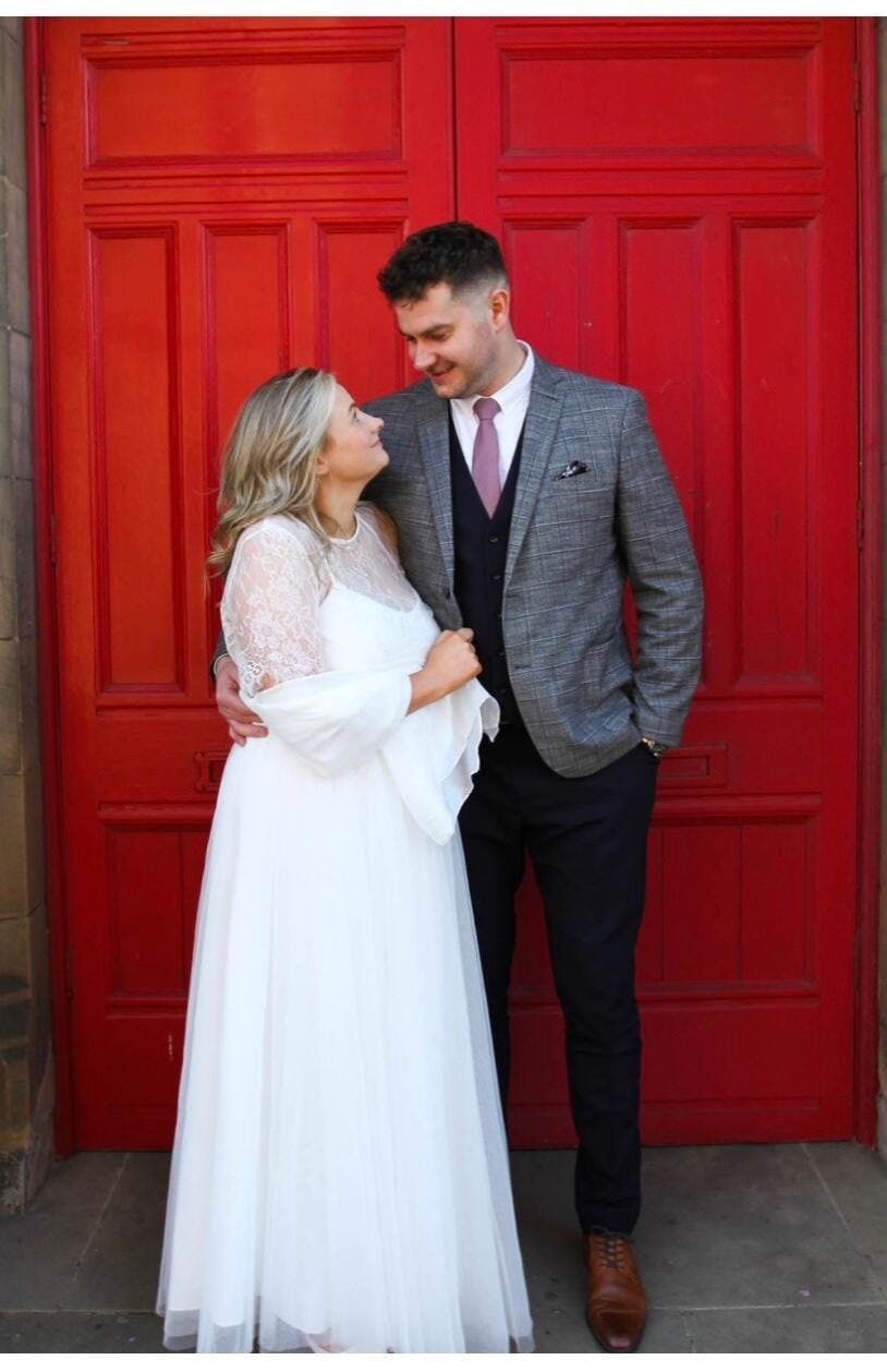This A-line wedding dress exudes vintage charm with its delicate spaghetti straps and lace bolero. The A-line silhouette flatters all figures, while the lace bolero adds a touch of romance and sophistication. Perfect for a bride seeking timeless elegance on her special day.