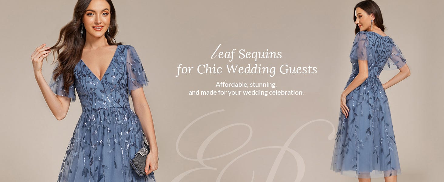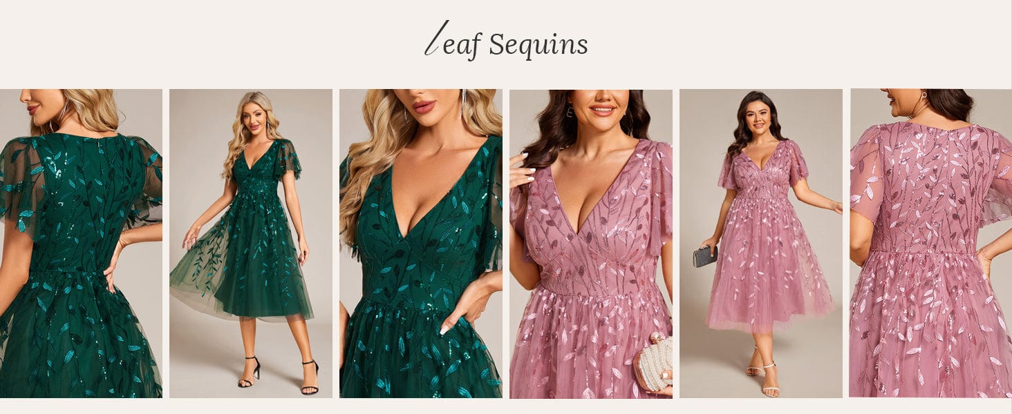 Make a statement with our elegant short sleeve tulle midi dress, perfect for wedding guests. This dress features delicate leaf-shaped sequins that shimmer beautifully, adding a touch of nature-inspired glamour. The soft mesh fabric creates a light and airy feel, while the short sleeves offer a comfortable and stylish option. With its sophisticated midi length, this dress strikes the perfect balance between chic and classy, making it an ideal choice for any special occasion.