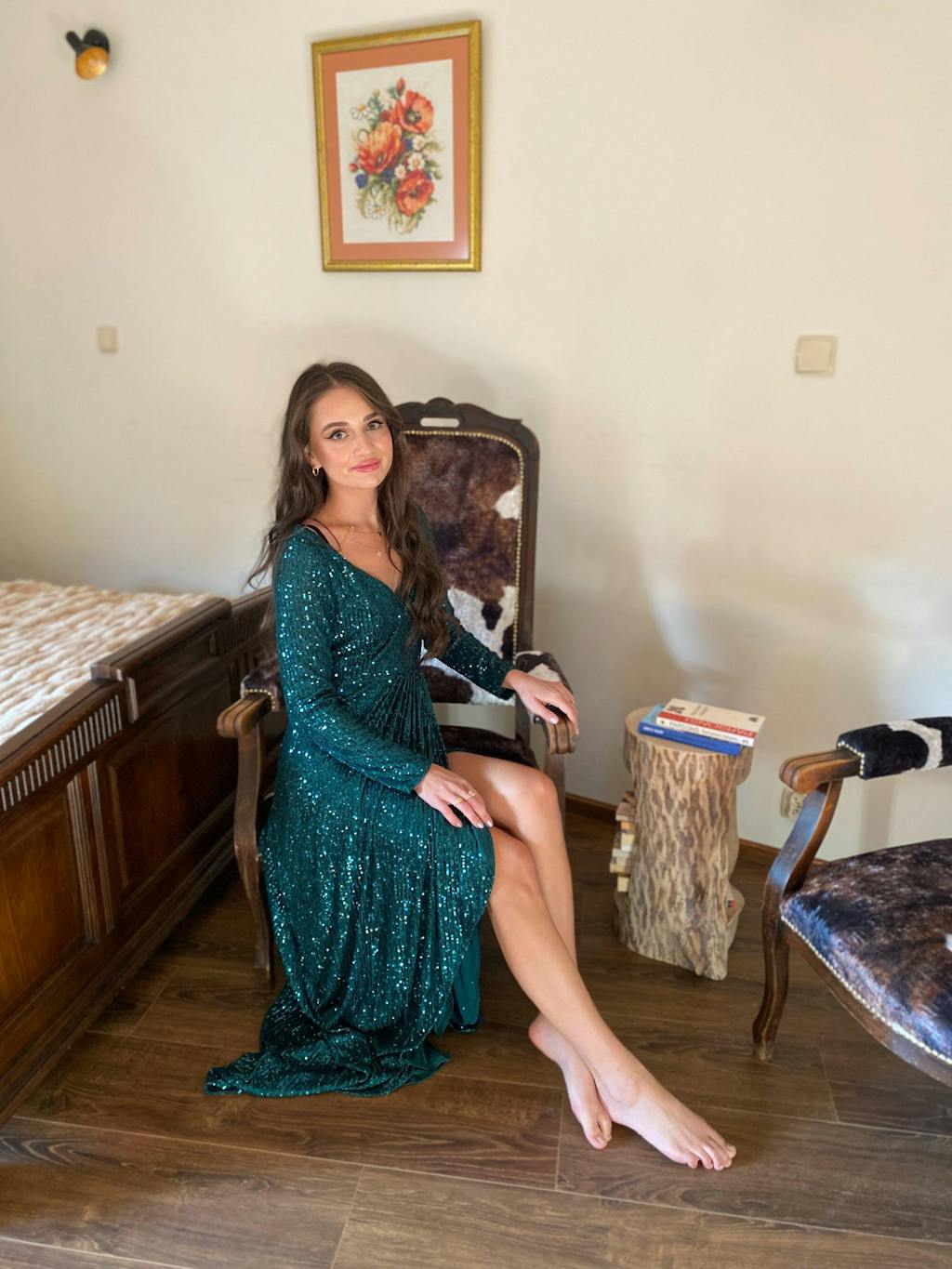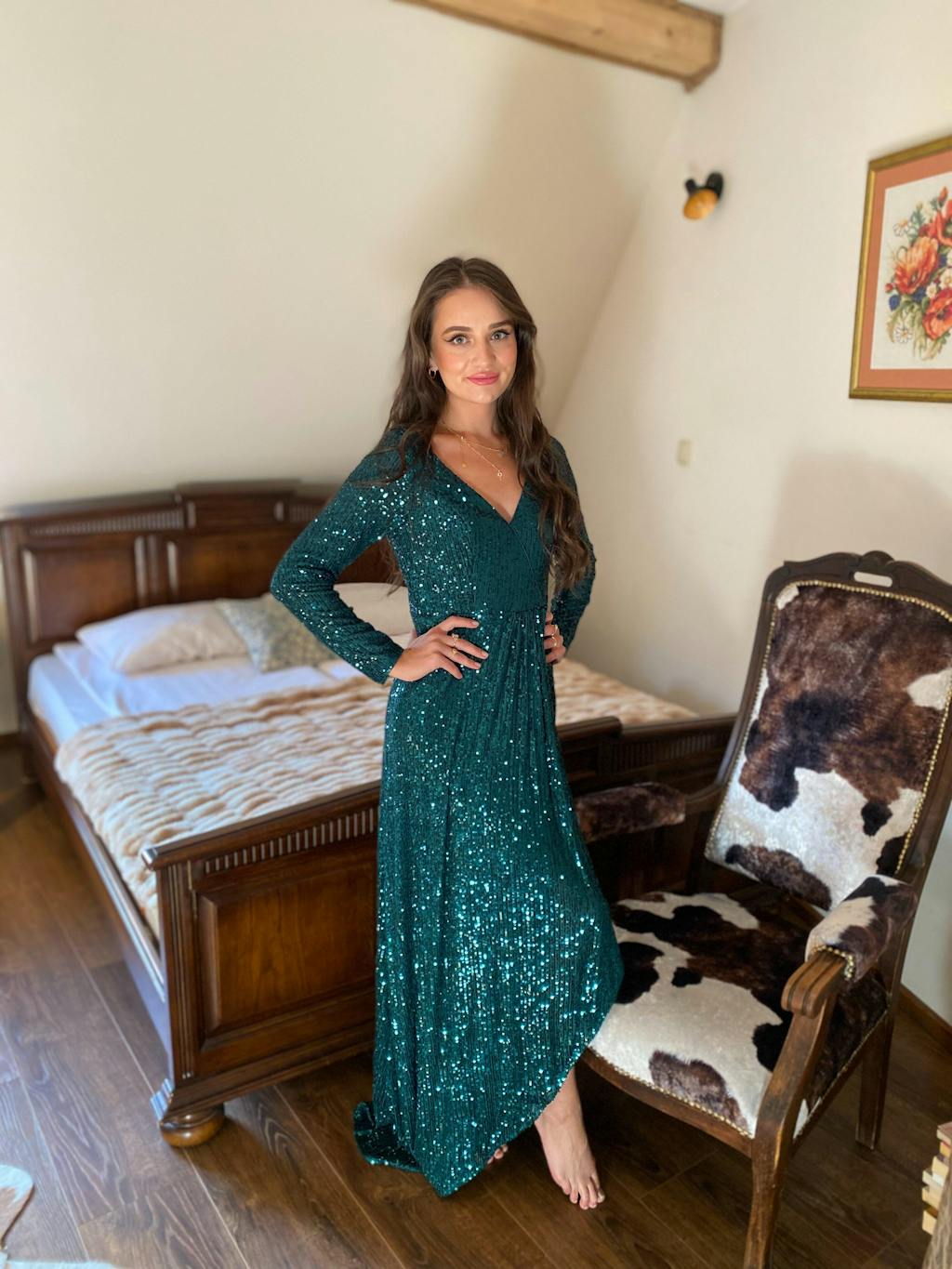 Long Sleeve V-neck Asymmetrical Hem Sequin Evening Dress(Final Sale)