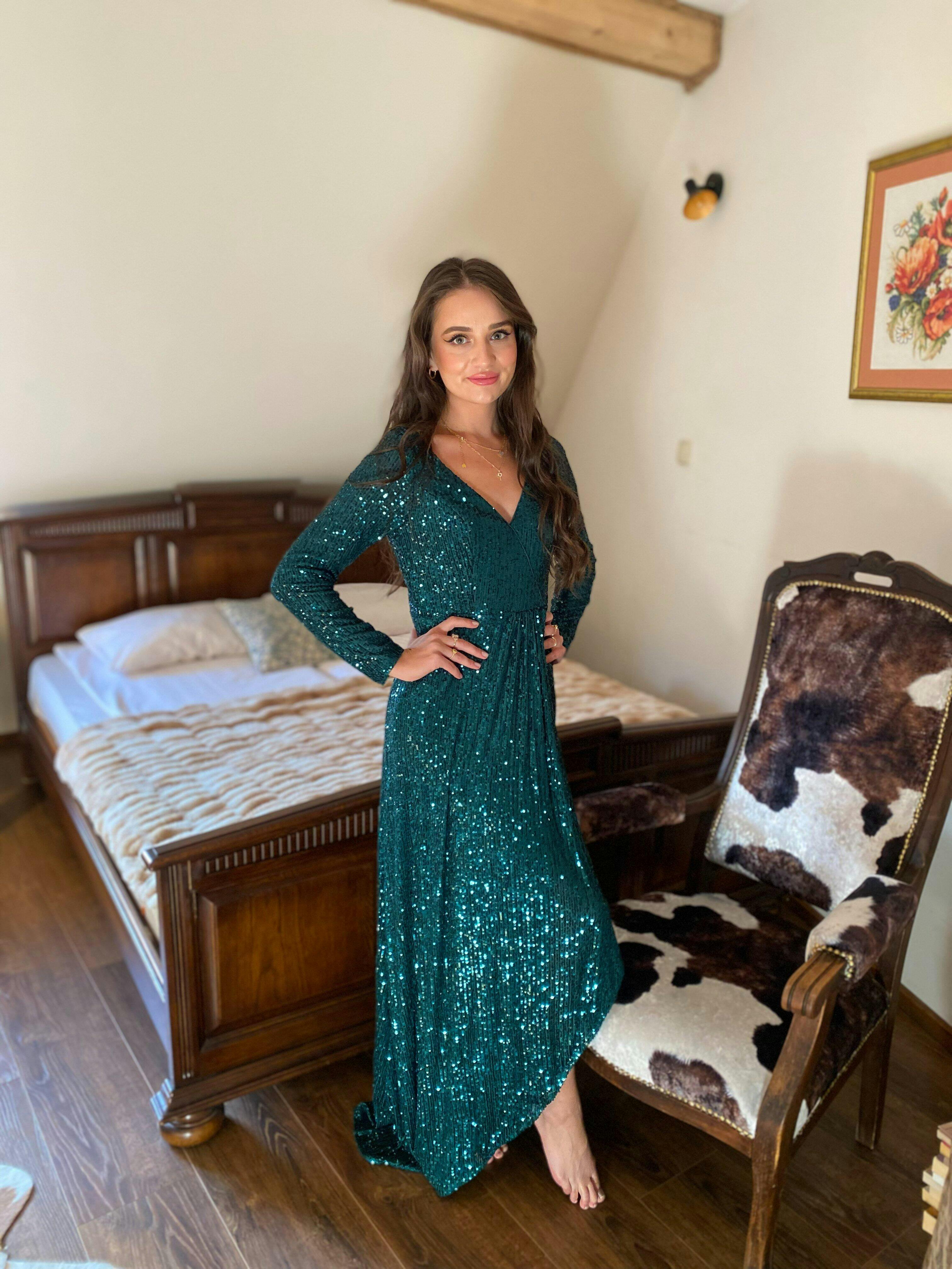 Long Sleeve V-neck Asymmetrical Hem Sequin Evening Dress(Final Sale)