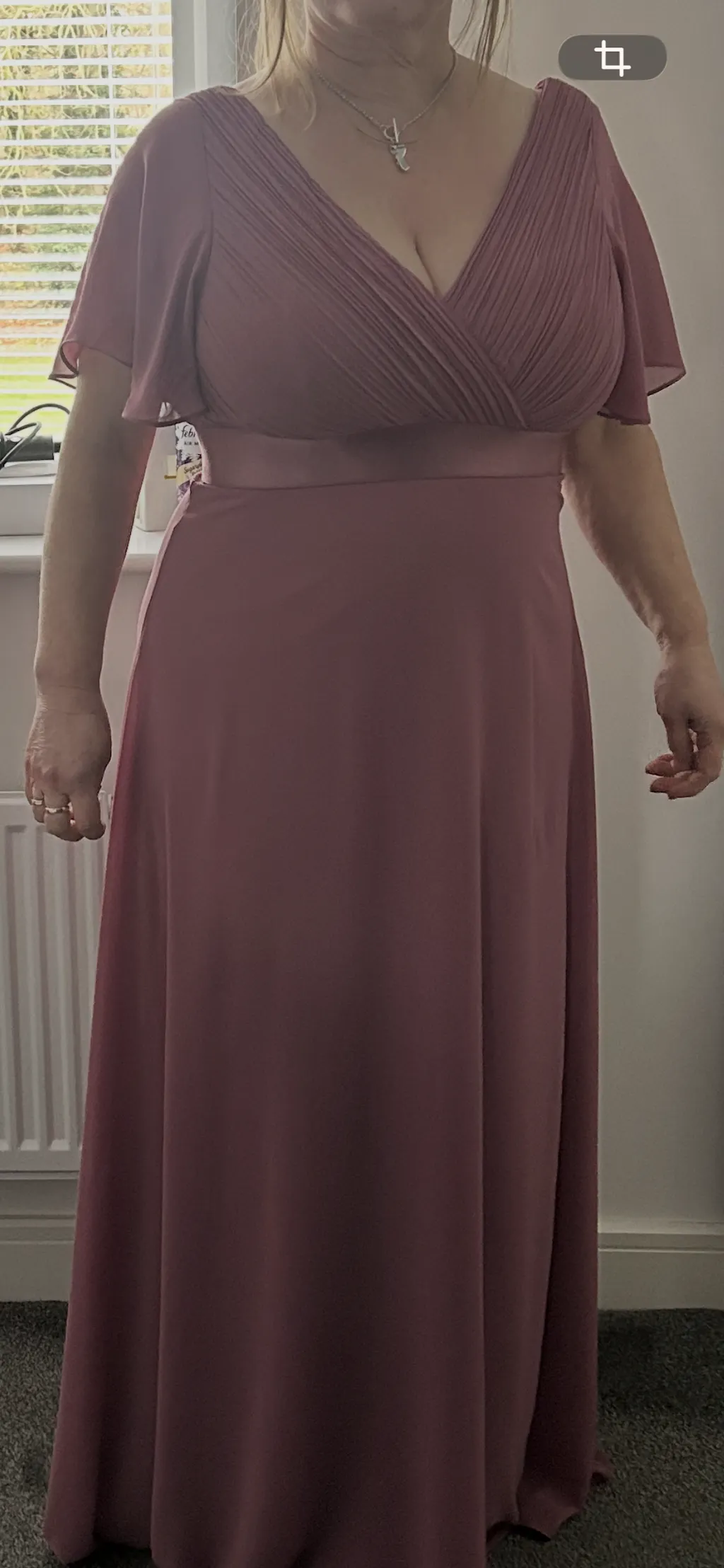 With flutter sleeves and a long flowing skirt, this simple white gown is like something out of a fairy tale. The empire waist with pleating at the chest creates an elegant silhouette, while a flattering V neck allows for any jewellery you might choose to wear. This basic wedding dress is a romantic choice for any bride.