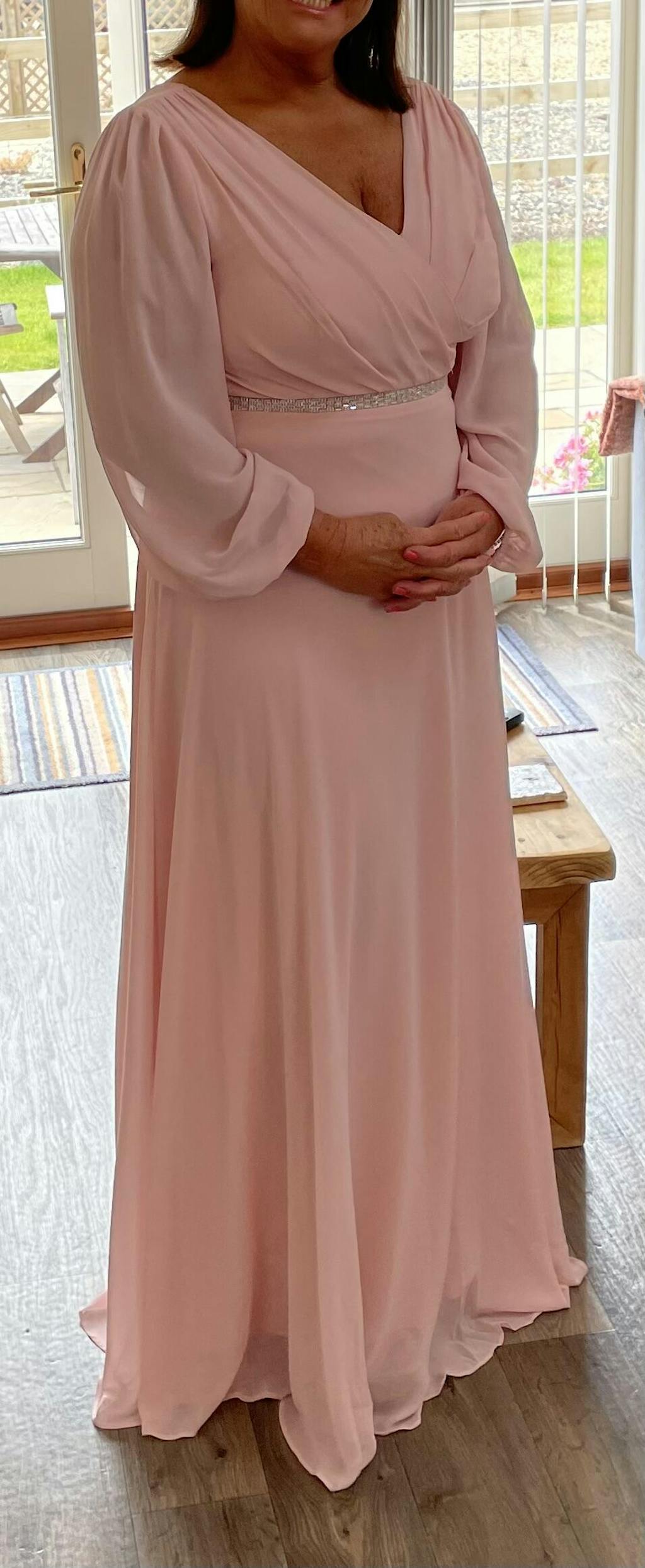 Pleated Double V-Neck Long Sleeves Shiny Belt Chiffon Evening Dress #color_Pink