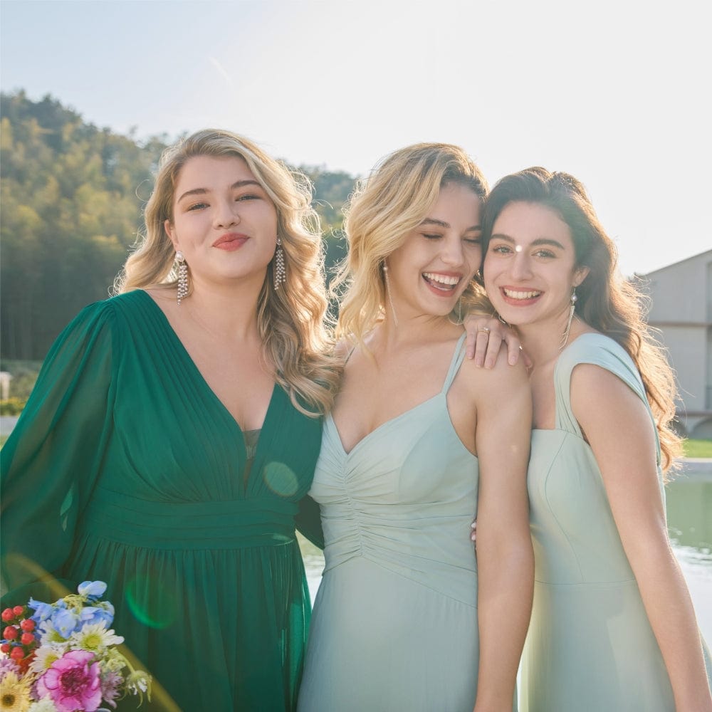 Radiate elegance in this plus size V-neck bridesmaid gown adorned with lantern sleeves and a high waist with pleats. A stunning choice to complement the beauty of your bridal party.