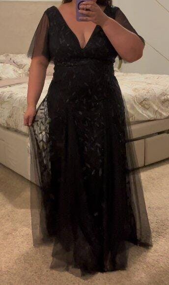 This plus-size evening gown features a double deep V neckline and ruffle sleeves. The shimmery leave design gives a romantic vibe. No matter what occasion, it will make you look gorgeous and elegant. Suitable for evening parties, cocktails, weddings, prom, homecoming, and graduation!