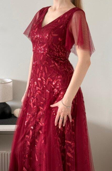 This evening gown features a double deep V neckline and ruffled sleeves. The shimmery leave design gives a romantic vibe. No matter what occasion, it will make you look gorgeous and elegant. Suitable for evening parties, cocktails, weddings, prom, homecoming, and graduation!