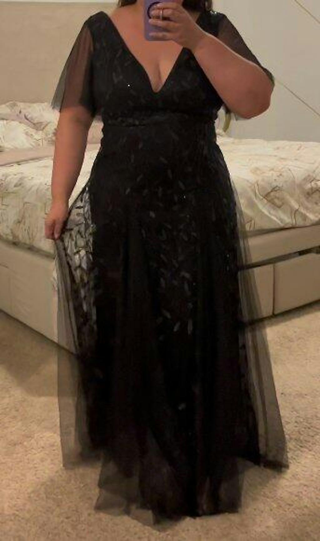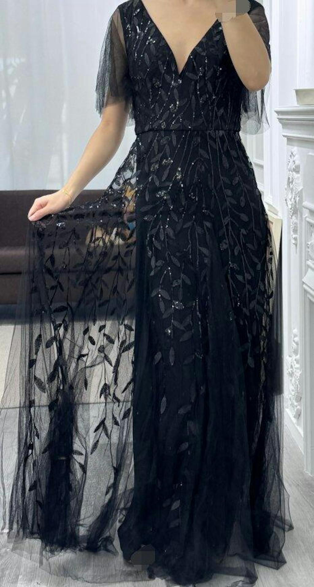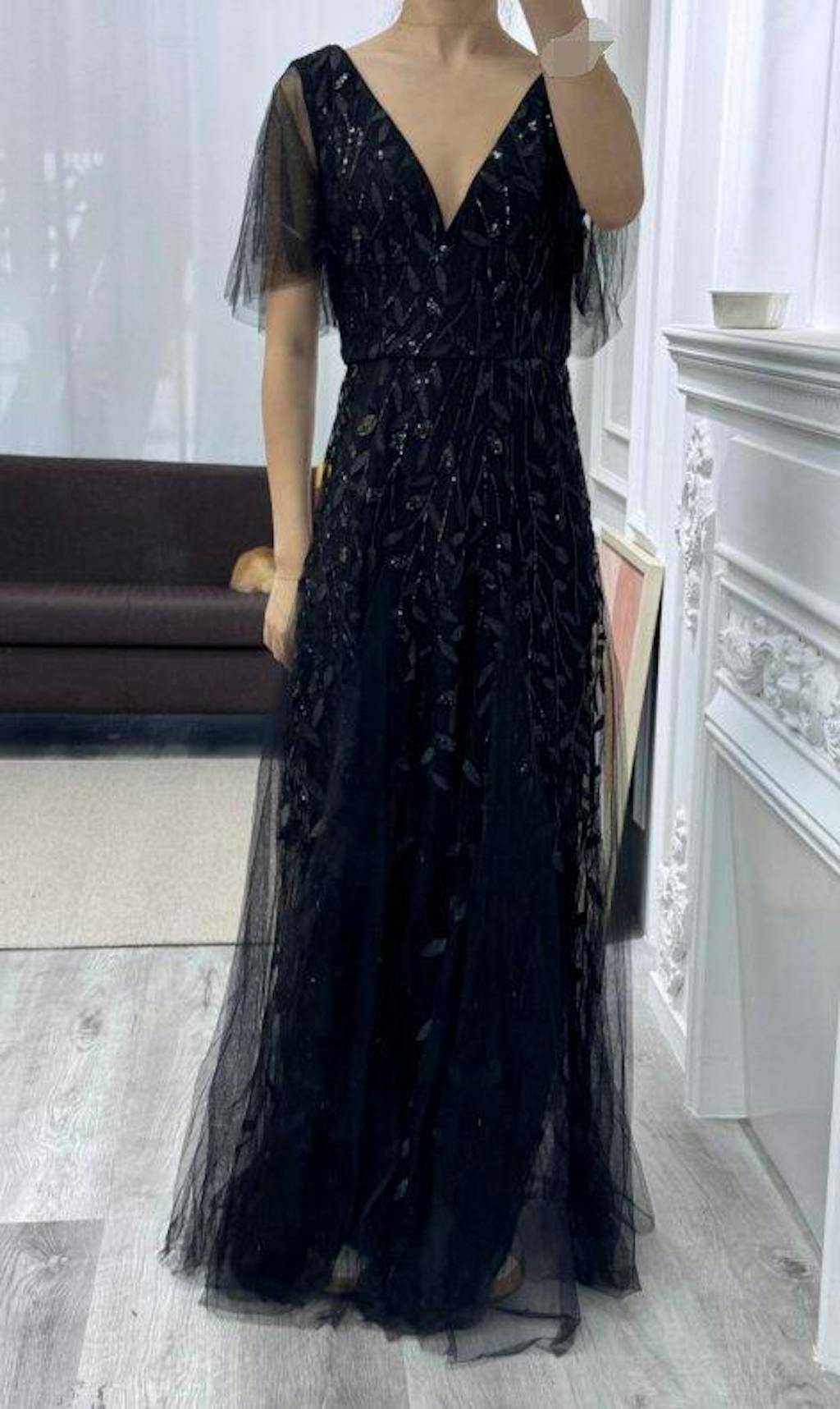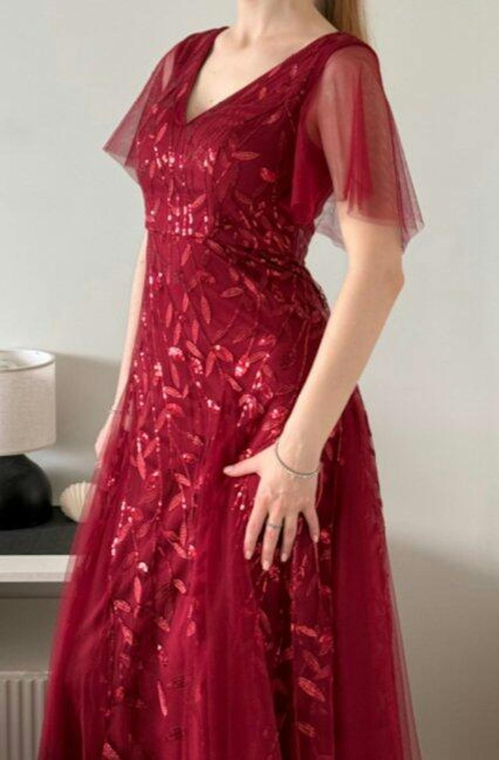 Arrive with class in this deep V, maxi wedding guest dress with slit sleeves. The dress for weddings gives that impression of a slimmer built with the bodice overlap and is topped with the shimmering floral applique and is pleated down to the A-line skirt at floor length.