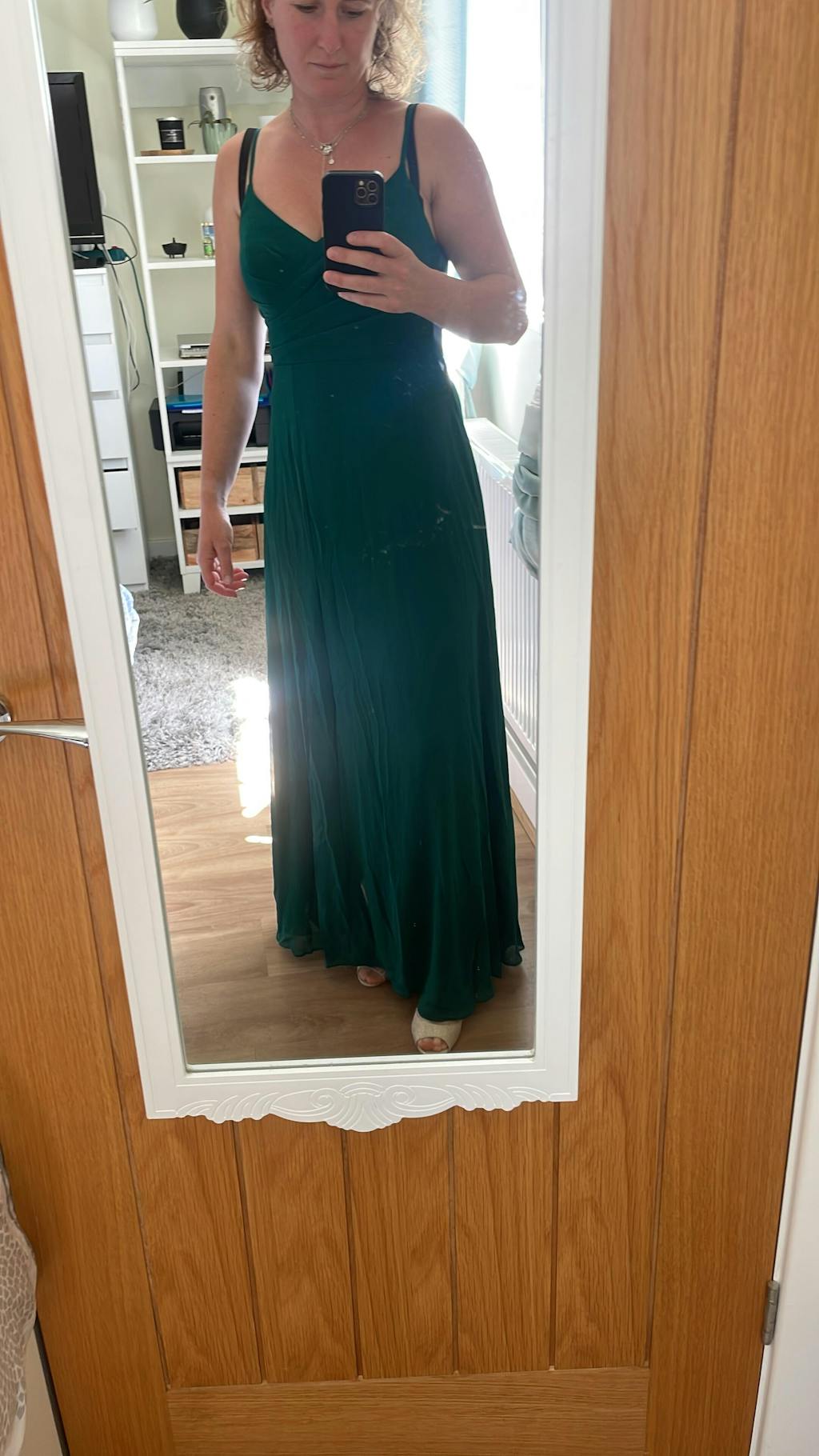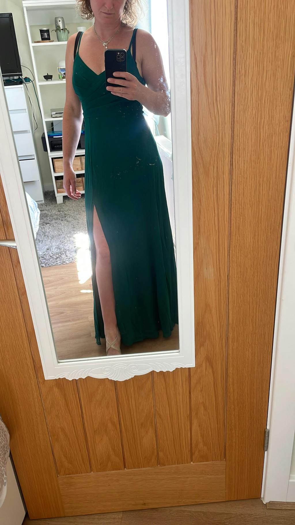 This beautiful bridesmaid dress will make picture-perfect memories with its a-line silhouette and daring front slit. Spaghetti straps and a plunging v-neckline give way to a cinched waist and floor-length fit. A low back finishes the look, complementing any hairstyle for your bridesmaids.