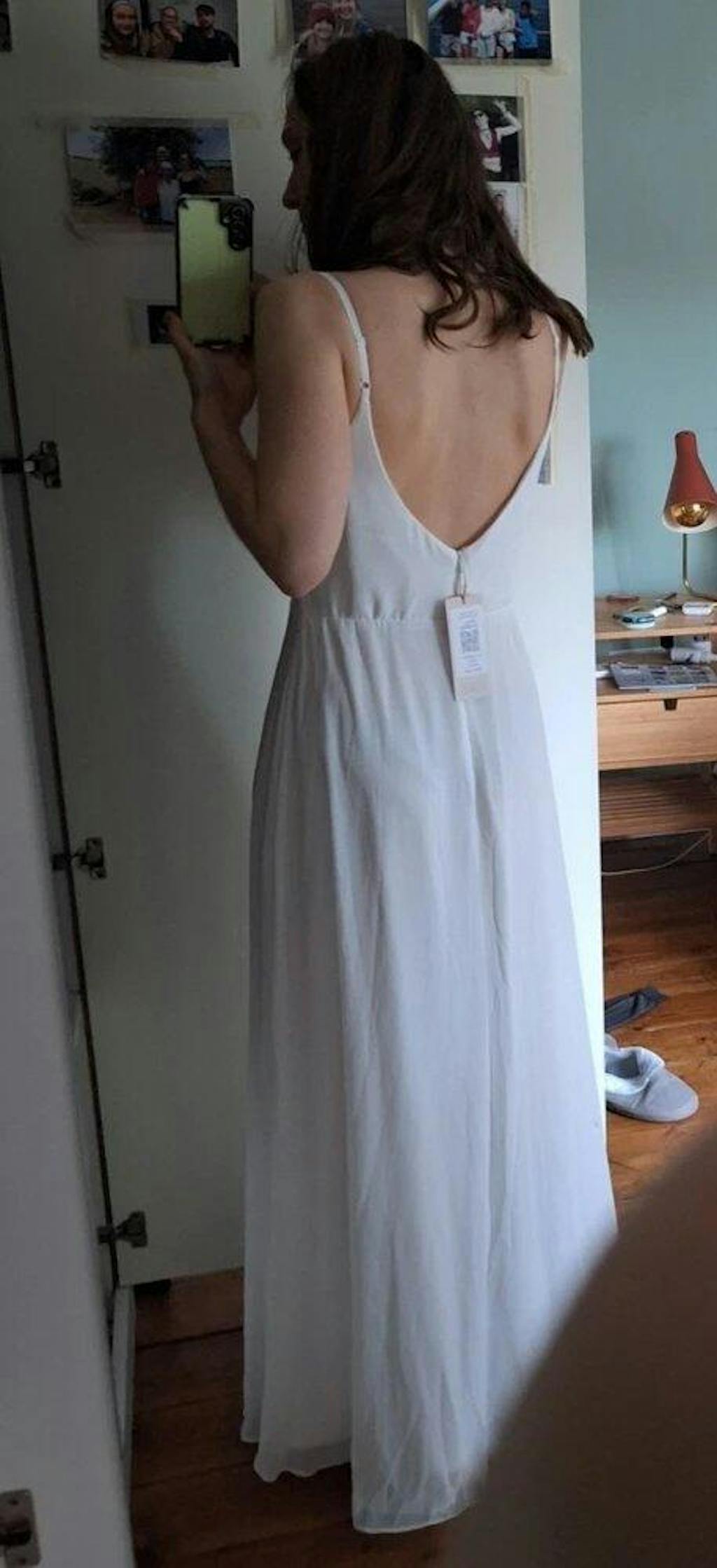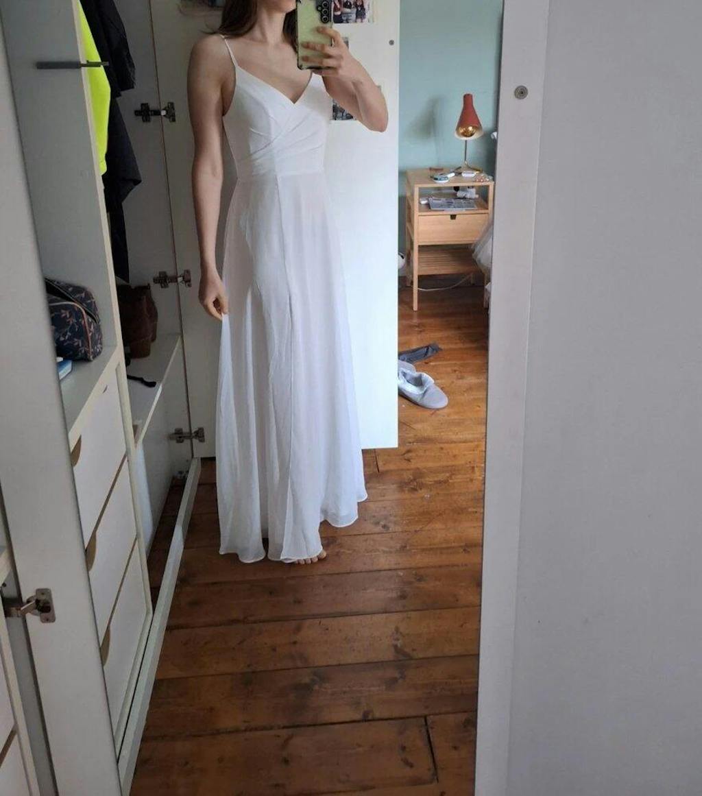 This beautiful bridesmaid dress will make picture-perfect memories with its a-line silhouette and daring front slit. Spaghetti straps and a plunging v-neckline give way to a cinched waist and floor-length fit. A low back finishes the look, complementing any hairstyle for your bridesmaids.