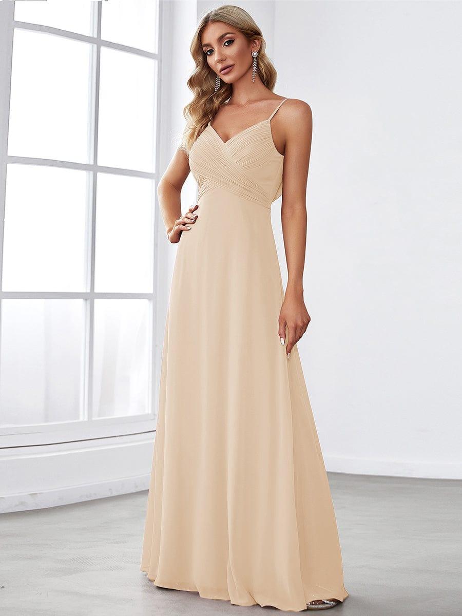This elegant and chic bridesmaid dress is extremely flattering for any body type. It is crafted with flowy chiffon fabric that moves with you. It consists of a sweetheart neckline, a pleated bodice, a draped low back, and ends with a floor-length skirt suitable for dancing the night away!