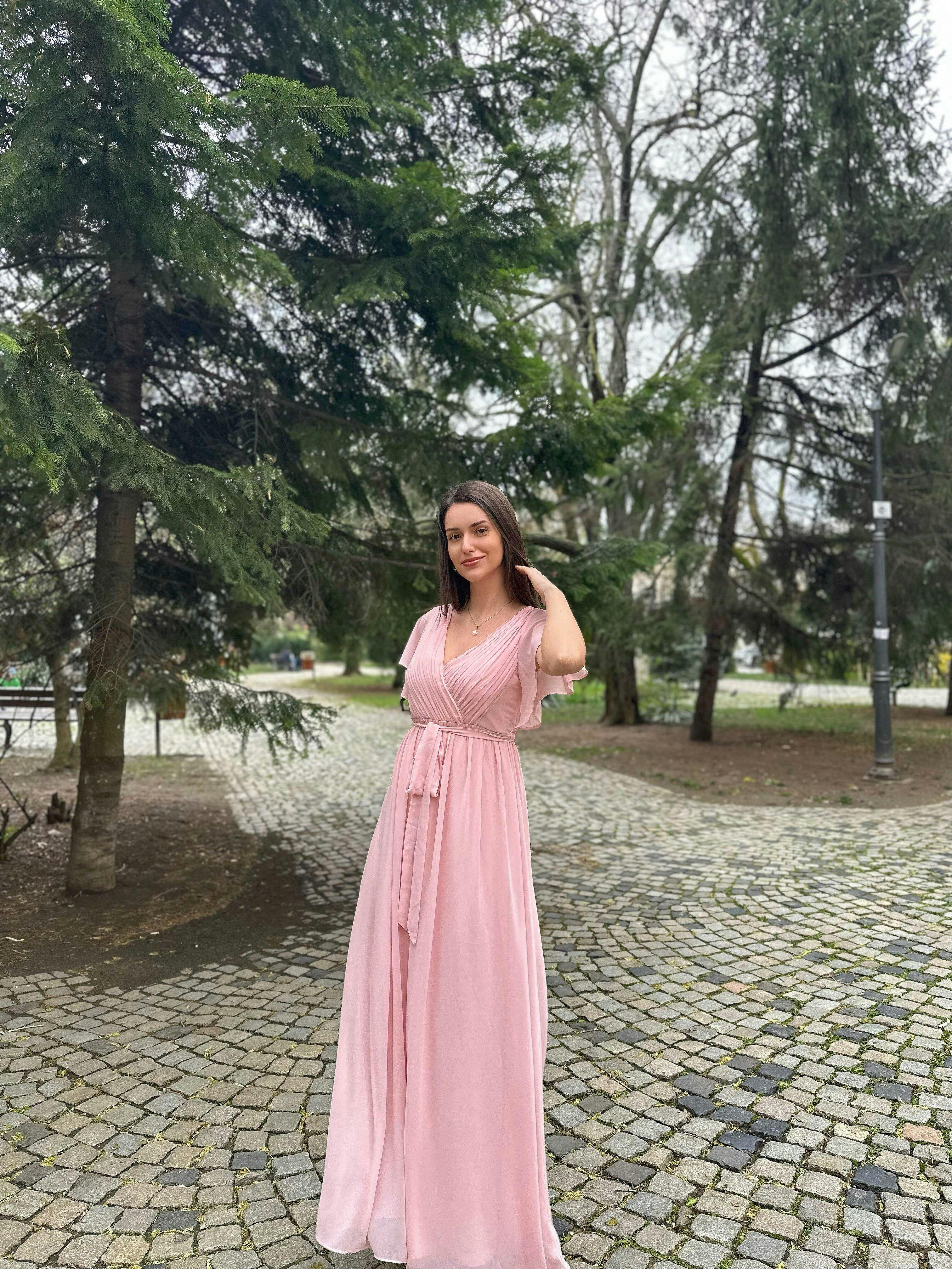 V-Neck Flutter Sleeve Floor-Length A-Line Chiffon Evening Dress #color_Pink