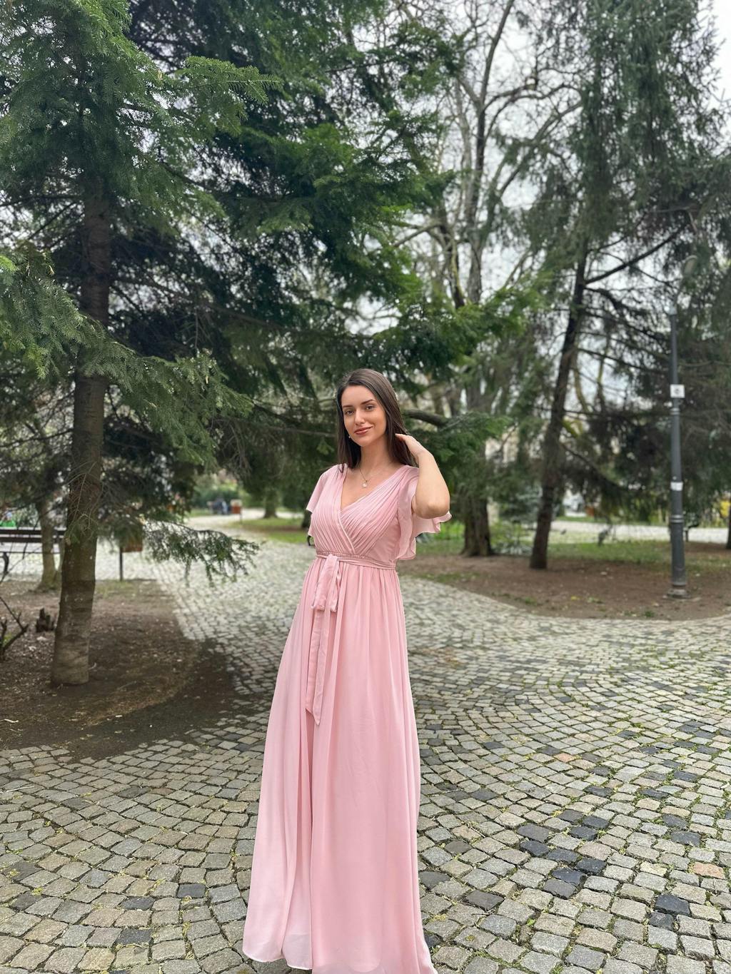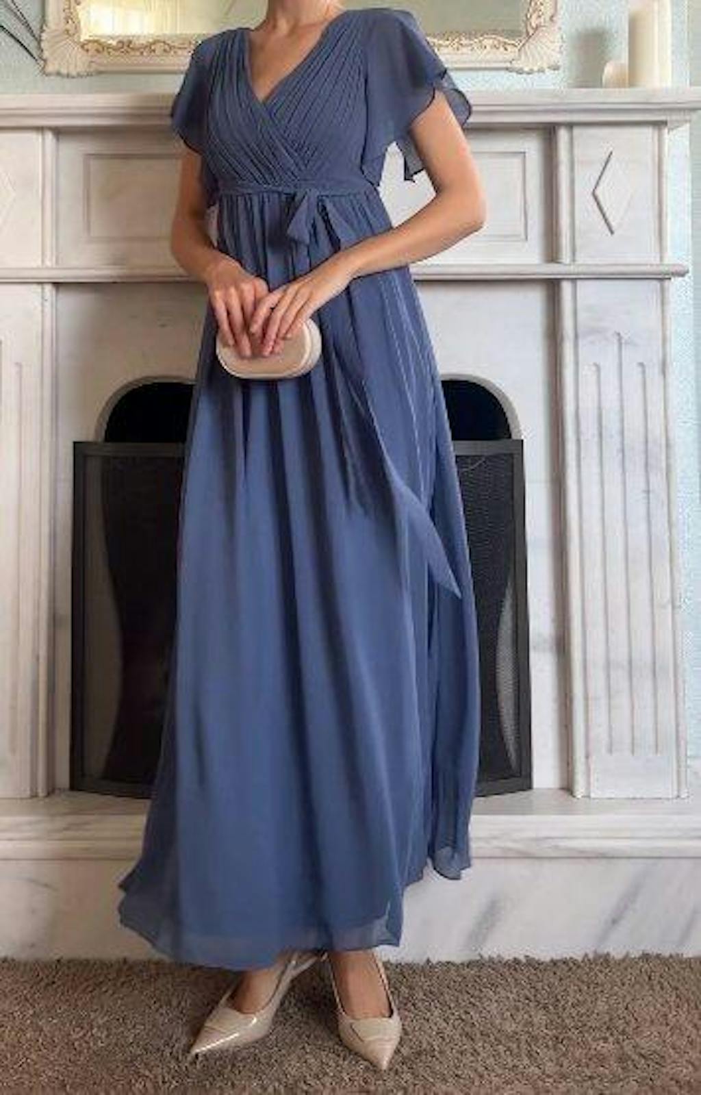 Need to make an entrance at your next formal event? This floor-length LEORA gown combines timeless elegance with can't-miss details. Flutter sleeves, a plunging v-neckline, and an A-line silhouette exude a timeless elegance worthy of every picture.