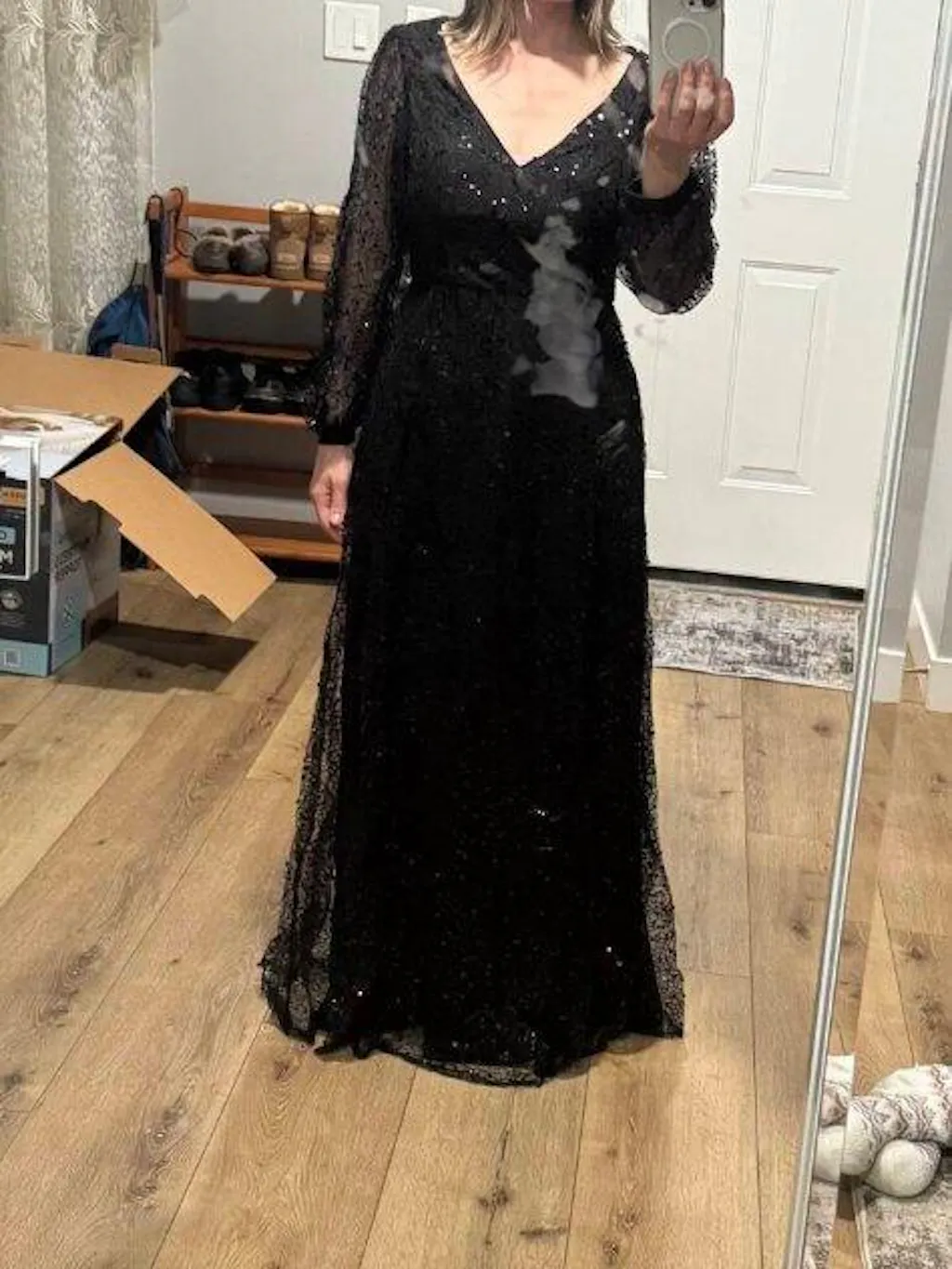 V-Neck Lantern Long Sleeve Sequin A-Line Evening Dress