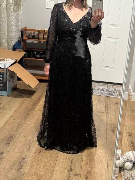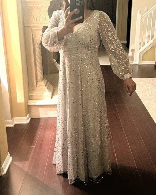 Make a statement at any special event with our shimmering V-neck lantern sleeve sequin A-line evening dress. The V-neckline adds a touch of sophistication, while the lantern sleeves create a unique and elegant look. The sparkling sequin embellishments catch the light beautifully, ensuring you'll be the center of attention. With its flattering A-line silhouette, this dress is designed to accentuate your figure and provide a comfortable fit. Perfect for formal occasions or glamorous evenings, this dress is a must-have for those seeking a show-stopping look.